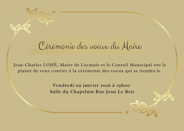 Jean-Charles LOHÉ, Maire de Locmalo, et l’ensemble du Conseil municipal ont le plaisir de convier les habitants de la commune de Locmalo à la cérémonie des vœux.