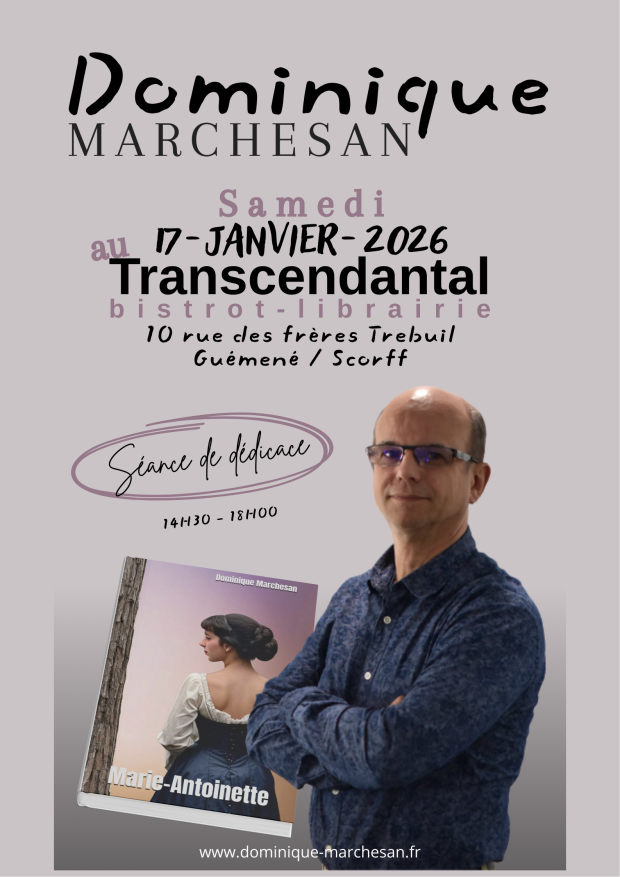 Monsieur MARCHESAN Dominique, auteur local, sera en séance de dédicace le samedi 17 janvier 2026 au Bistrot-librairie Le Transcendantal, à Guémené-Sur-Scorff.